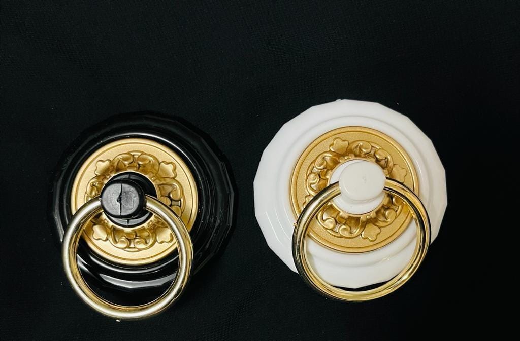 Enhance your furniture with Furniture Decorative JT-059, featuring ornate ring handles with gold detailing on black or white bases. Perfect for drawers, cabinets, and wardrobe doors. Durable, elegant, and easy to install.