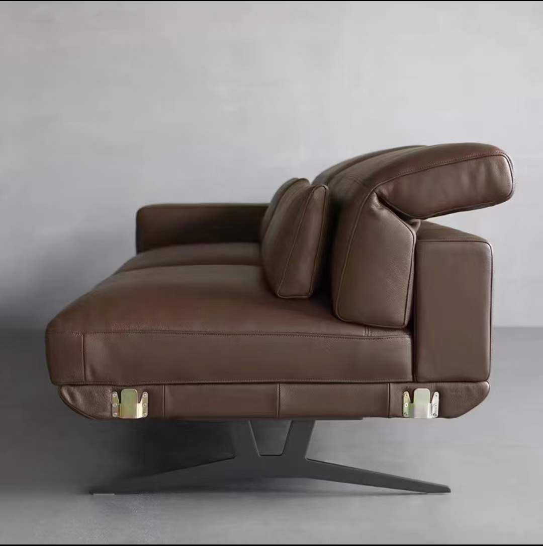 Experience luxurious relaxation with the JT-002—an elevated sofa design that flawlessly fuses style and comfort. Wrapped in a sumptuous, cocoa-brown leather, its sleek silhouette is accented by a distinctive metal base that gives this piece a modern edge. The adjustable headrests offer personalized support, perfect for leisurely lounging or engaging conversation. Meanwhile, high-density foam cushions and a sturdy hardwood frame ensure long-lasting durability and cozy seating for years to come.