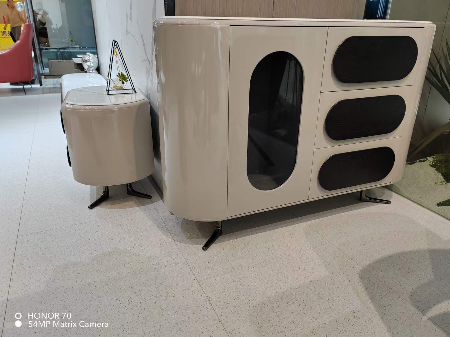 The JT-004 is a sleek, cream-colored cabinet featuring curved edges, striking cut-outs, and ample storage. Its modern design, sturdy legs, and glossy finish offer both style and practicality—perfect for elevating any contemporary interior.