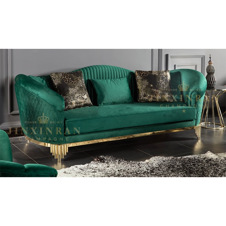 Add a touch of regal elegance to your living space with the JT-017—a striking sofa wrapped in sumptuous emerald-green upholstery. Accented by a gleaming gold-tone base and adorned with plush coordinating pillows, this piece instantly becomes the focal point of any room. Its generously padded seat and gently rounded back provide both style and comfort, making it ideal for upscale entertaining or leisurely lounging. Constructed with a sturdy wood frame and high-density foam, the JT-017 not only dazzles the eye but also offers long-lasting support, ensuring it remains a luxurious staple in your home for years to come.