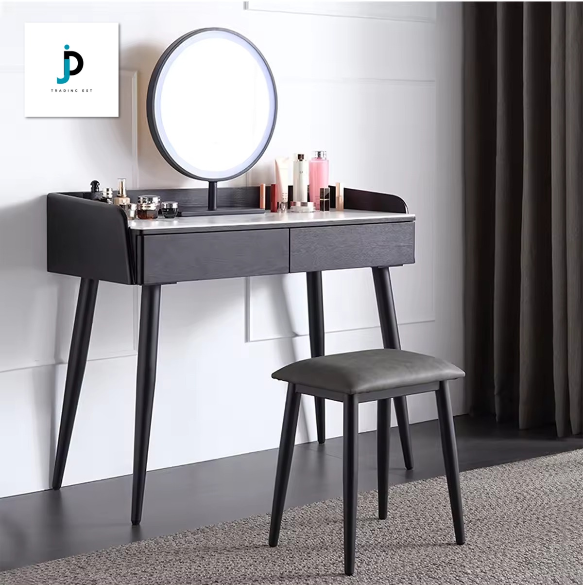 Elevate your daily beauty routine with the JT-020—a contemporary vanity set that blends sleek style and practical functionality. Crafted in a chic black finish, the vanity features clean lines, tapered legs, and a smooth tabletop for displaying your essentials. A circular mirror adds a polished touch while offering a clear reflection for makeup application or hairstyling. Two spacious drawers provide convenient storage for cosmetics, jewelry, and accessories, keeping your space organized. The matching stool includes a cushioned seat for added comfort, making the JT-020 an elegant and practical addition to any bedroom or dressing area.