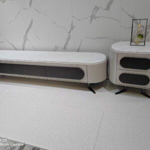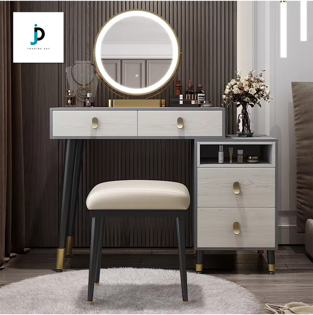 The JT-023 vanity set features a sleek design with a round mirror, ample storage, and a cushioned stool—bringing both style and convenience to your daily beauty routine.